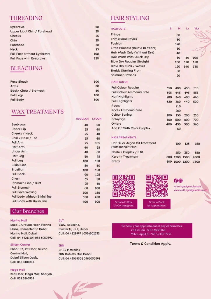 GOOD Based on 767 reviews Posted on Musleh AlmutairiTrustindex verifies that the original source of the review is Google. Big thanks to [AFSHAN-Beauty] & [GAZAL- Manger’s ] for their outstanding service! Your professionalism and kindness made my day. Highly recommend😊Posted on Lakshmi YatheendranTrustindex verifies that the original source of the review is Google. Ms. Sherin did my haircut and it was perfect.Posted on Ella May TalaoTrustindex verifies that the original source of the review is Google. Afshan is the best!! She did my waxing. Her hand is just light, def book her againPosted on L BTrustindex verifies that the original source of the review is Google. Cutting Edge has always been my go-to salon post Covid. Shefali is a lovely lady, never failed to provide a topnotch front desk customer service, she’s a delight to deal with - always patient to explain available deals, services, etc. She’s bubbly and a charming lady. On the otherhand, Gazal, the Manager, is def approachable and an amazing lady. She takes effort to present herself fab before the clients. She dresses well and looks after her appearance worthy of being the face of the salon but was never intimidating but as a matter of fact is tender hearted and kind. Imelda, the nail technician, has been looking after my nails from day 1. Her eye for details is impeccable and am always grateful and amazed with the perfection my nails look after her work. She does magic with my nails♥️ I also love the interior of the salon♥️Posted on Janice SolidumTrustindex verifies that the original source of the review is Google. Thank you for the good service of Randy Mae & Mary Chris (Mani/Pedi), Nitu (facial, waxing) & Kulsum (hairdresser). They are caring to their customer and approachable too.Posted on Aamenah KhanTrustindex verifies that the original source of the review is Google. Found this place randomly at the mall. Came in as a walk in customer for my waxing. Their technician Afshan was a true gem! She understood my sensitive skin and recommended a wax accordingly. The best part was that there was no burning post wax session and I was done within 30 minutes (full body wax) Highly recommend the place and do ask for Afshan for waxing and skin related problems!Posted on abigail annah nelsonTrustindex verifies that the original source of the review is Google. Cynthia at the spa is always amazing And Elizabeth at the saloon she’s the best ❤️Posted on Raj Kumar AhujaTrustindex verifies that the original source of the review is Google. Melika is the best beautician I have ever met...she just made my day and my hair very very beautiful...lots of ❤️